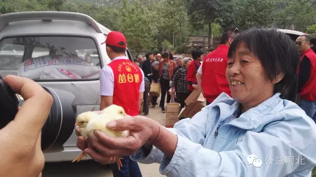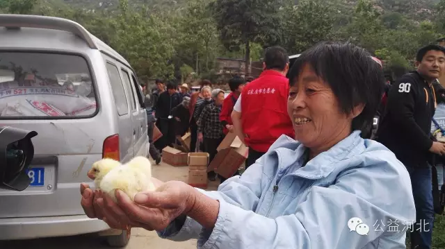 记者们长枪短炮对着孵化场一通狂拍,工作人员在车间里耐心地分拣,也不知道是挑公鸡母鸡,还是健康鸡和体弱有病的鸡,最让人揪心的是,随手丢弃一只只病鸡的动作,这简直是草菅鸡命啊,你可以放弃它,但是你也应该尊重它啊,这也是生命啊!跑题了!大家了解了简单情况,志愿者们把1200只雏鸡12个纸箱子搬到了车上,旁边的温会长不厌其烦地嘱咐:路上开慢点,开慢点,小鸡们还小呢,开快了晕车!这老顽童,知道大家辛苦,用笑声给大伙鼓劲儿。  高速,国道,县道,村道,然后是崎岖的山路,两个多小时的颠簸,一行人来到了平山县苏家庄乡十里沟村,几百人的小村子,名副其实的十里沟,群山环绕中夹杂着稀疏的人家,村里大多是中老年人,年轻人都上学和出去打工了。所以雏鸡的发放仪式,四十多户养殖户代表也都是老年人居多,拄着拐杖、背着箩筐、拿着纸箱子,六七十岁以上的不在少数。
