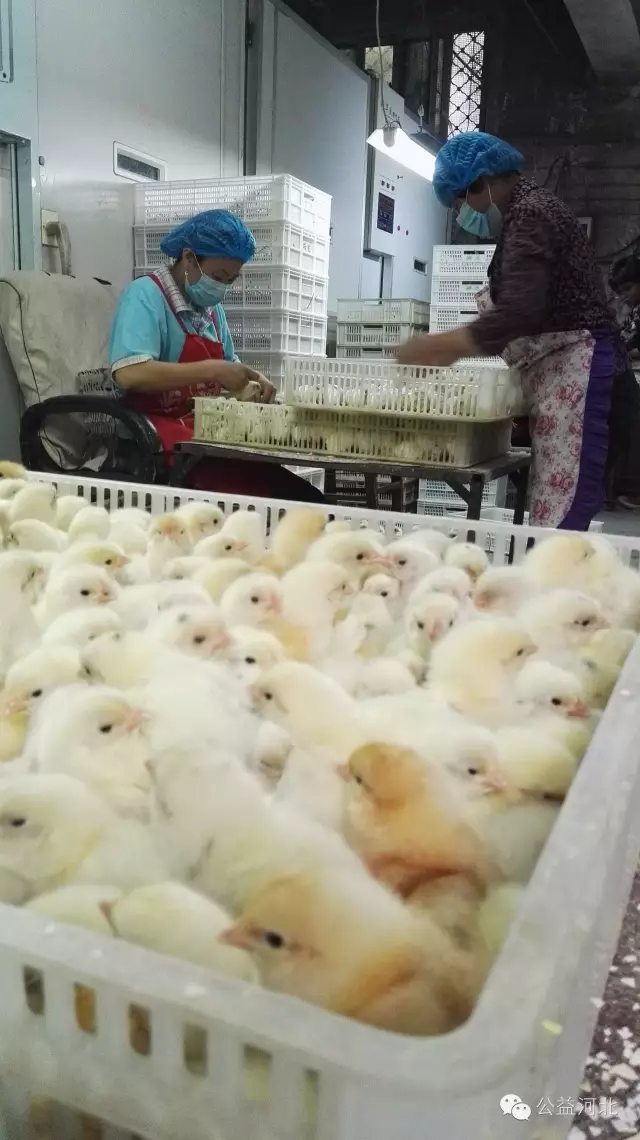 第一站是正定县城北边的一家雏鸡孵化场,志愿者、《公益河北》《热心帮忙团》电视台记者们相继赶到,一箱箱破壳而出的雏鸡还真是让大家看了眼界,无菌恒温的孵化箱里,一堆堆的蛋壳顶出一个个毛茸玩具般的小鸡们,生下来就能扑打着翅膀站稳,想到这些毛茸茸的小东西几个月后,就能生蛋为山里的老乡们增加收入,每个人都很高兴。